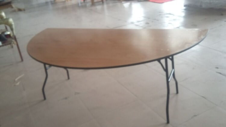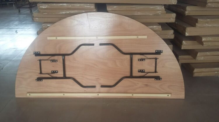We are a half-round wood folding table manufacturer, we have our own factory. As a semi-circle banquet table supplier, we can provide the lowest price. This half-moon folding table is very useful since it can be instantly stored and is easy to carry at the same time. This durable table was built for constant use in hotels, banquet rooms, training rooms, and seminar settings. Not only is this table durable enough for the everyday rigors of commercial use this half-round table can be used in the home when it comes to setting up your own personal party plans.